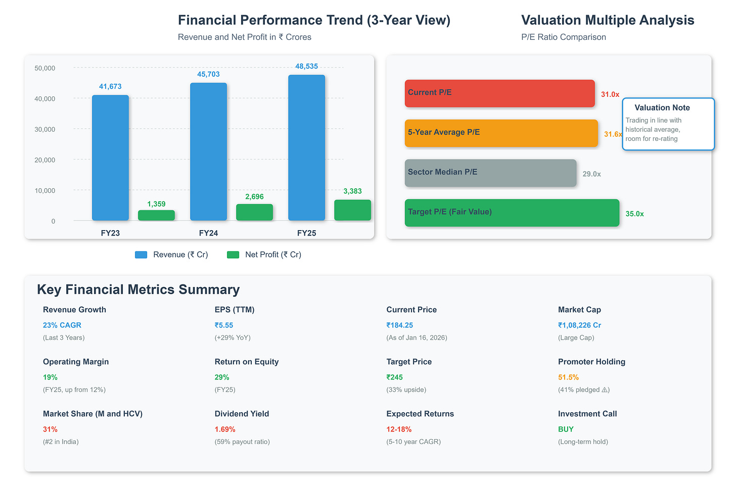 Why this range? India’s commercial vehicle industry should grow 7-9% annually as infrastructure spending continues, e-commerce expands, and fleet replacement cycles kick in. This company is positioned to grow slightly faster - call it 10-12% annually - by gaining market share in LCVs, expanding exports, and selling higher-margin products. Add a 2% dividend yield, and you’re at 14% total returns conservatively.