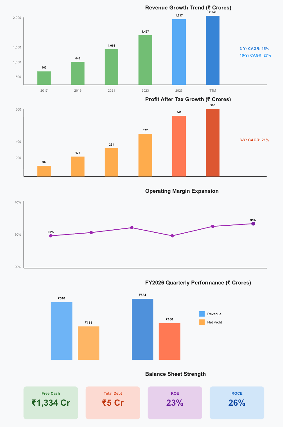 Q2 FY2026 (September 2025): Revenue reached ₹534 crores, up 11% year-over-year and 5% sequentially. Profit after tax was ₹160 crores, marking a 23% increase from last year’s September quarter. Operating profit margin stayed strong at 35%. EPS for the quarter was ₹20.32.
