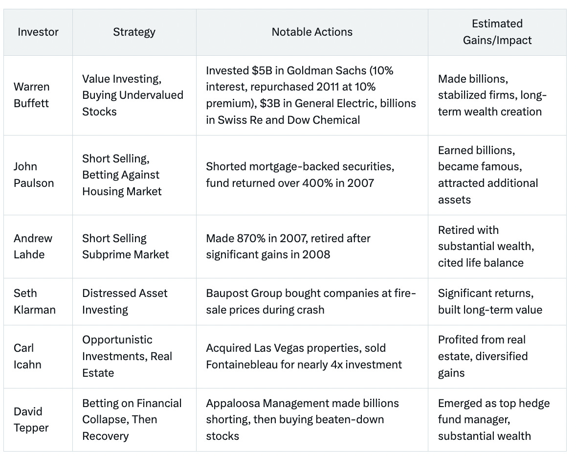 Several investors capitalized on the crash, using strategies like value investing, short selling, and distressed asset purchases. Below is a detailed table of key investors and their approaches: