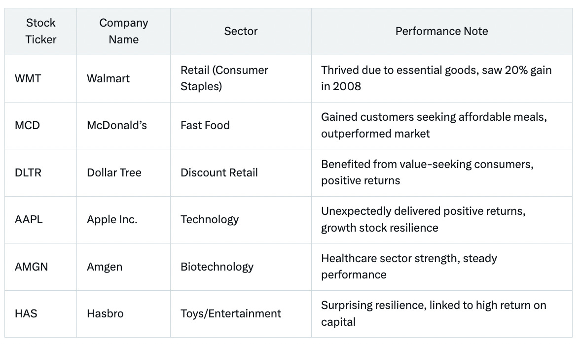 These stocks, primarily in consumer staples, healthcare, and discount retail, were less affected because their products and services remained in demand during economic hardship. For instance, Walmart and McDonald’s saw increased patronage as consumers cut back on luxury spending, while Apple’s performance was notable given its growth stock status (Stocks That Went Up in 2008 | Plus ETFs, Bonds, Gold).