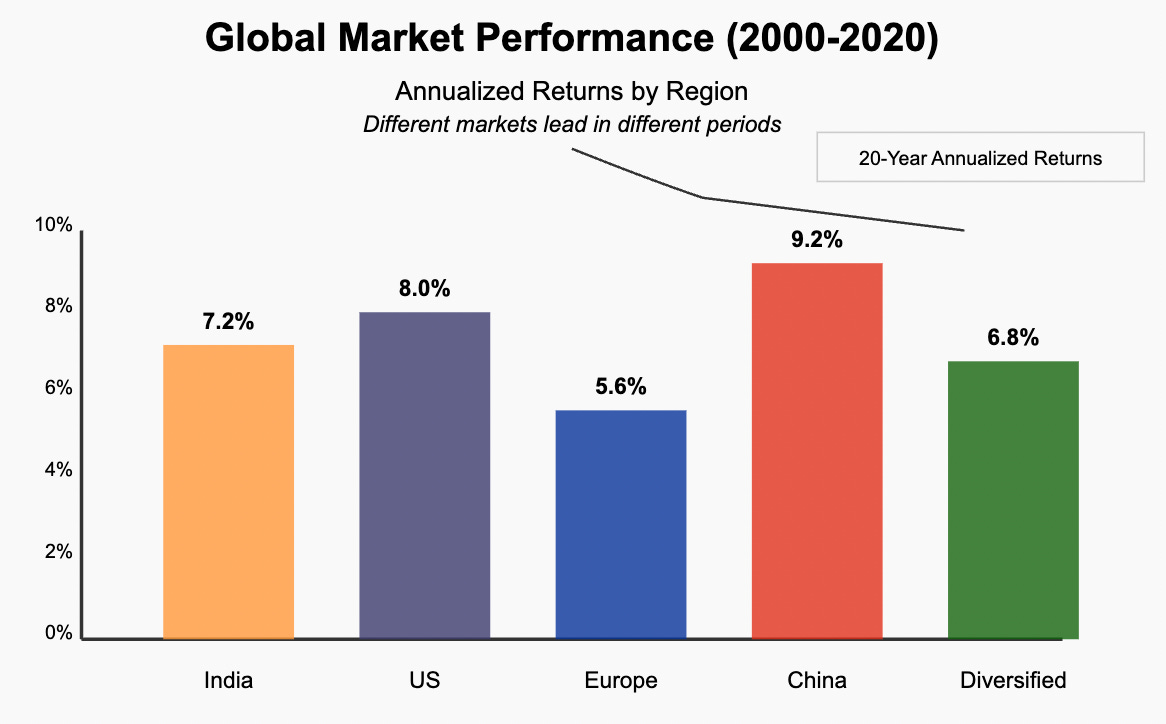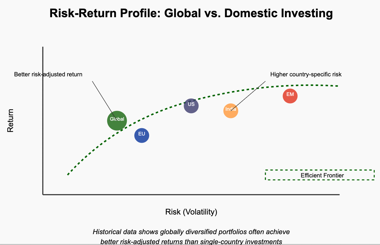 India represents just 3.5% of global GDP, meaning purely domestic investors miss over 96% of worldwide opportunities. Different economies operate on varying cycles—while India may face headwinds, markets across Asia, Europe, or the Americas might be thriving simultaneously.