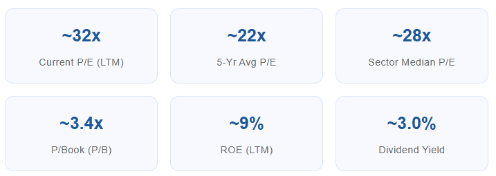 At ₹802, the stock trades at roughly 32x trailing earnings — and that’s with compressed profits. That actually makes it more expensive than its historical average of around 22x. So no, this isn’t a screaming bargain on a P/E basis right now.