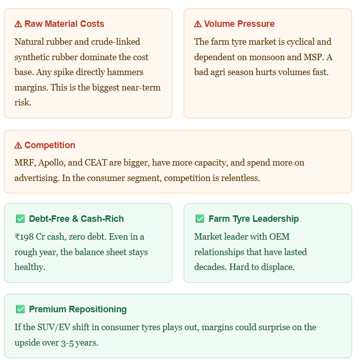Management has clearly articulated a premiumization play in consumer tyres — moving away from volume-competitive mid-market segments toward SUV, luxury, and EV. This is smart; margins are structurally better in premium. The farm segment OEM relationships are sticky — BEML, tractor OEMs, and agricultural equipment manufacturers depend on this company. That’s not easy to replace.