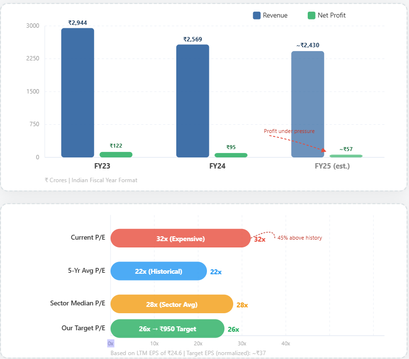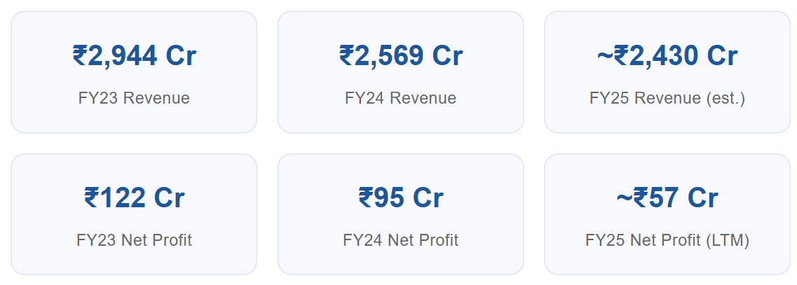 The numbers tell a tough story. Revenue has declined roughly 8% per year over the last three years — an ugly 3-year CAGR of approximately -9%. FY23 was the peak year; since then, subdued demand, raw material cost swings, and volume pressures have eaten into both topline and margins. Operating profit margins have compressed from around 7.1% in FY23 to below 5% on a trailing basis. The latest reported quarter showed margins collapsing to just 4.3%.