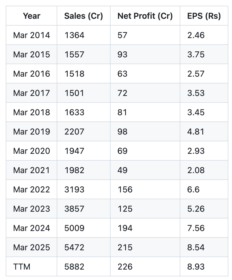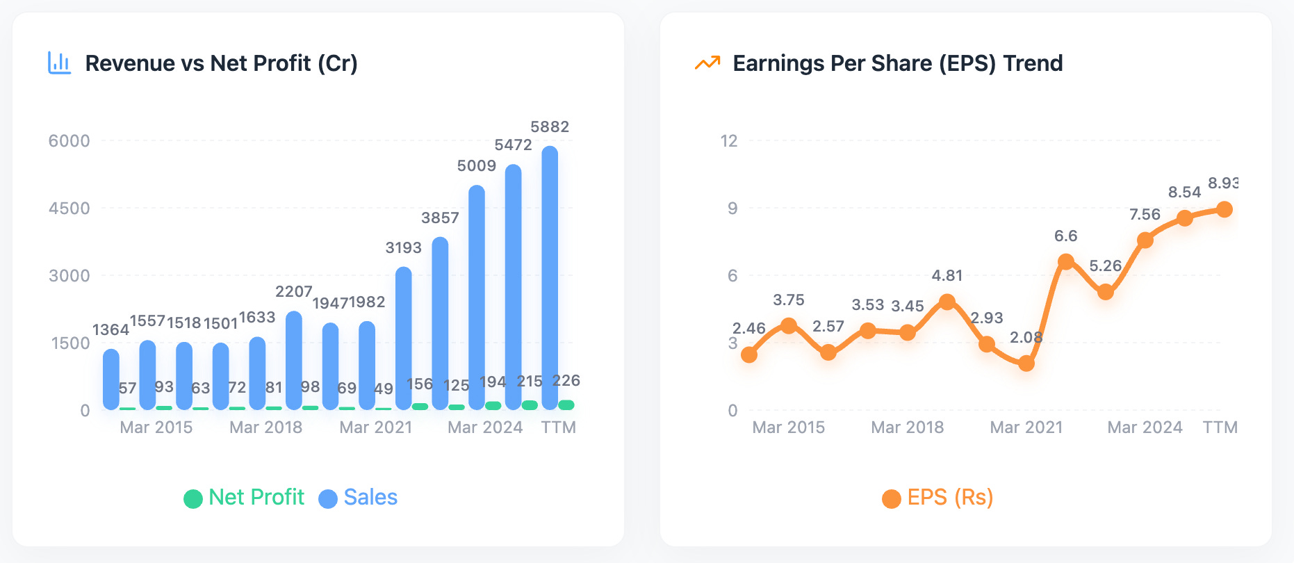 The latest TTM data reveals a net profit of ₹226 Cr and an EPS of ₹8.93, underscoring robust earnings acceleration. The implied TTM net profit margin has expanded to approximately 3.9%, a notable improvement from 2.5% in Mar 2021.