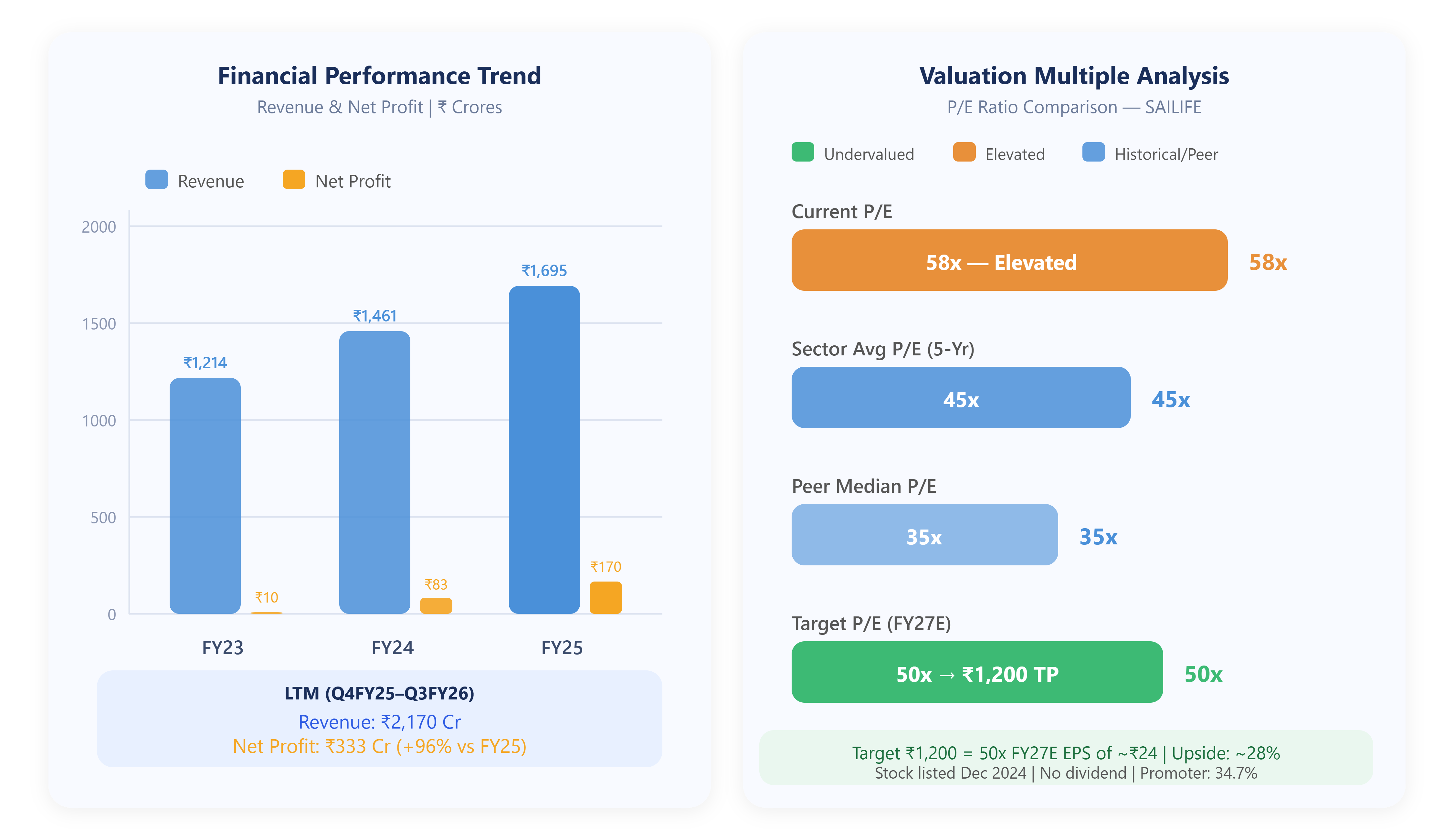 Target Price Rationale: At ₹1,200 — approximately 50x FY27E EPS of ₹24 — there’s ~28% upside from current levels. That’s a conservative 50x multiple for a business growing earnings at 30%+ with expanding margins and a strengthening balance sheet. The risk to this target is a broader market de-rating or a slowdown in global pharma outsourcing. The case for ₹1,350+ exists if FY27 earnings beat or if the sector re-rates upward on a global China+1 CRDMO supercycle narrative.