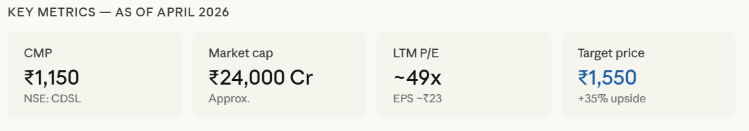 15-year perspective: If India’s demat account base reaches 50–60 crore (still only ~50% adult penetration), transaction volumes and issuer base grow proportionally, and the business continues to compound earnings at 12–15% annually, the stock could realistically deliver 8–12x from current levels. Patient capital will be rewarded.
