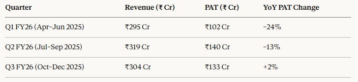 Here’s the thing — FY26 looks worse than it actually is. Prior-year quarters benefited from large one-time dividend payouts from subsidiaries. Strip those out, and core operations are actually growing. The sequential rebound from Q1 to Q2 (PAT up 37% quarter-on-quarter) shows the underlying engine is running fine.
