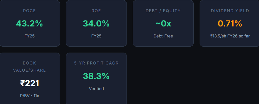 The stock has pulled back over 37% from its all-time high of ₹3,778 hit in May 2025, and now trades around ₹2,380. The fall has brought the P/E down from peak levels, but at ~42x trailing earnings, it’s still no screaming bargain. Here’s the thing — for a company growing profits at over 38% CAGR over five years with zero debt and rising margins, a 42x multiple is defensible.