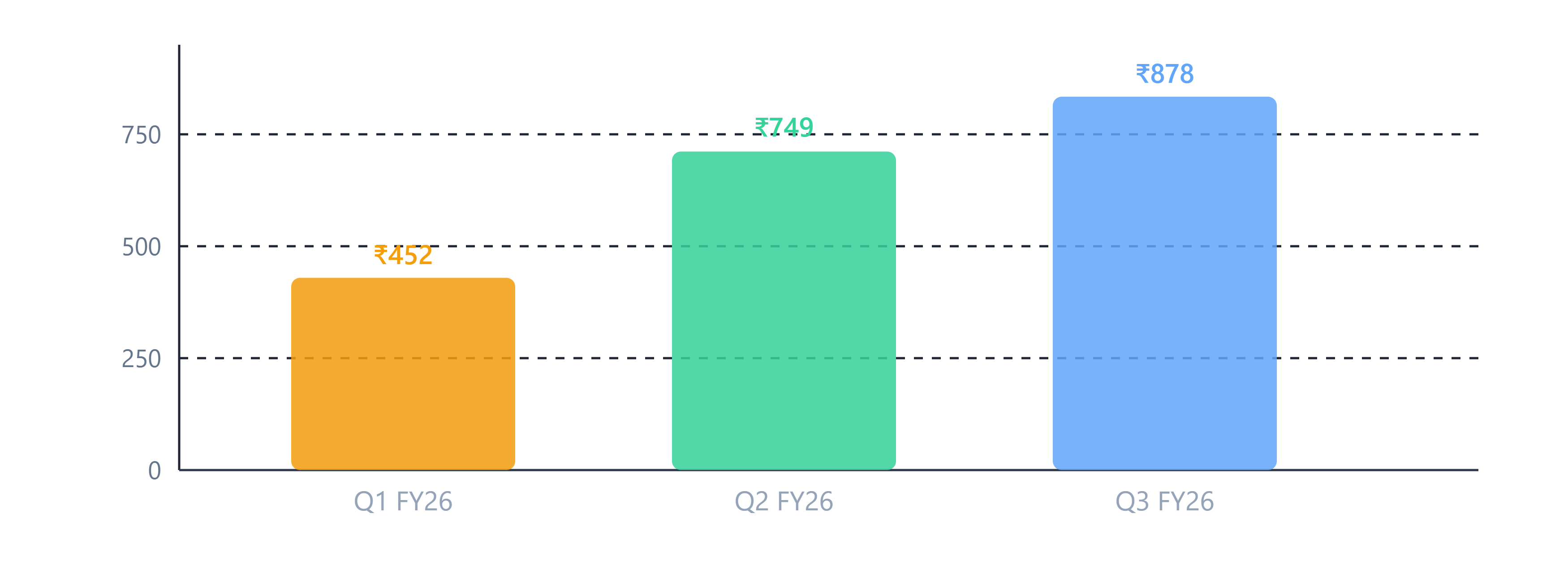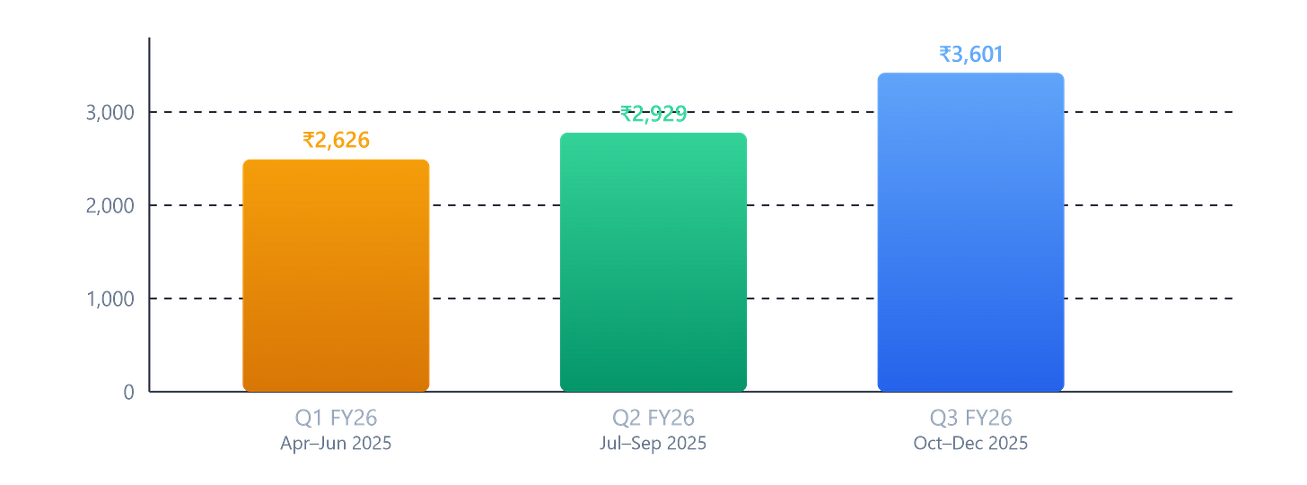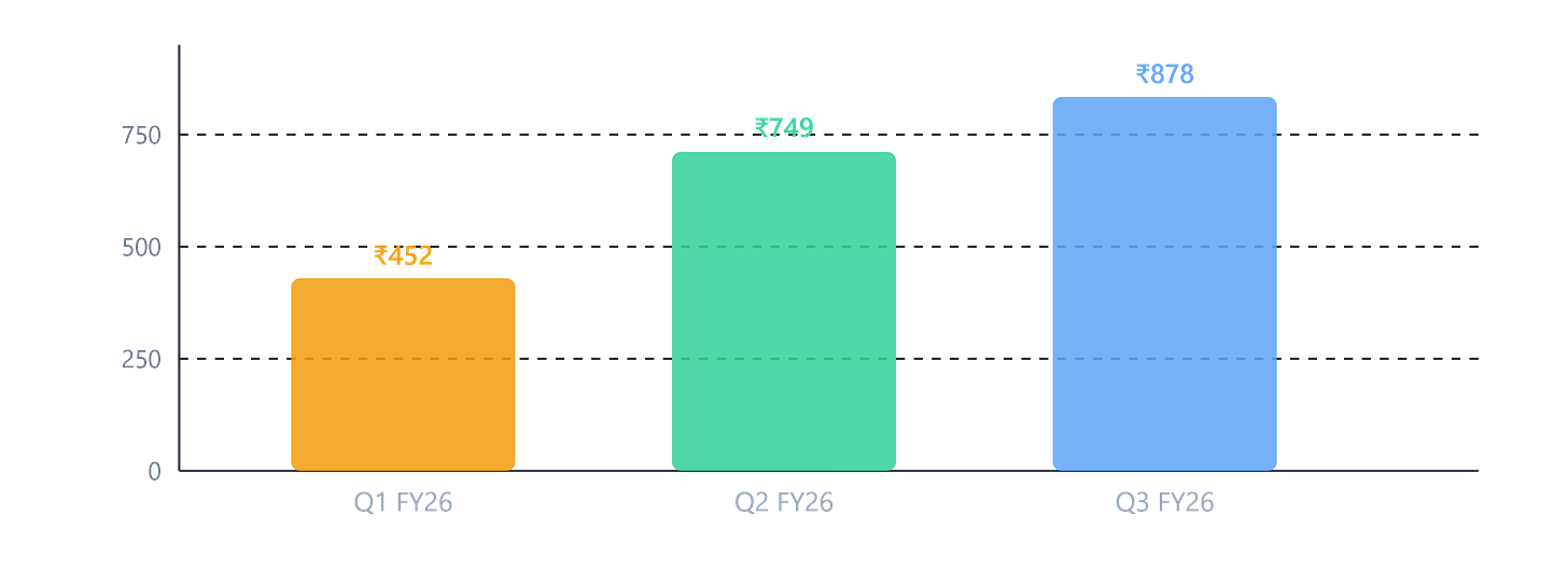 A couple of things stand out. First, Q1 FY26 PAT was relatively low at ₹452 crore because operating margins dipped — this is normal in shipbuilding. Revenue is milestone-based, so in quarters where fewer milestones are certified, margins compress. By Q3, margins rebounded to 24% EBITDA, and profit hit ₹878 crore — the best quarter ever. Second, the nine-month FY26 PAT of ₹2,081 crore already surpasses the entire FY25 first-half performance. The full year is shaping up to be another record.
