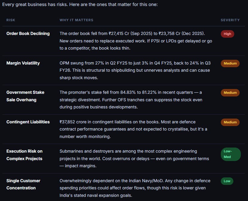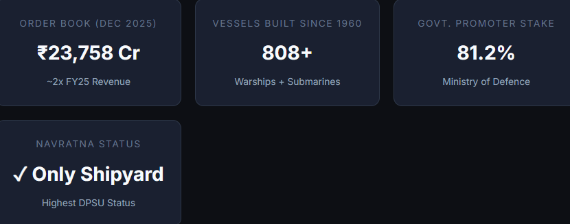 Here’s the situation in plain English. This company sits in the most protected corner of Indian defence manufacturing — naval warships and submarines. The government doesn’t just favour it; the government is its customer, its promoter (holding 81.2%), and its biggest fan. You can’t get more captive than that.