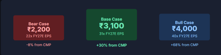 On a forward basis, if FY26 full-year EPS comes in around ₹82–85 (tracking to ₹2,081 crore PAT in 9 months, with a strong Q4 likely), the stock at ₹2,380 is at ~28–29x forward earnings. That’s a more reasonable entry point than peak valuations.
