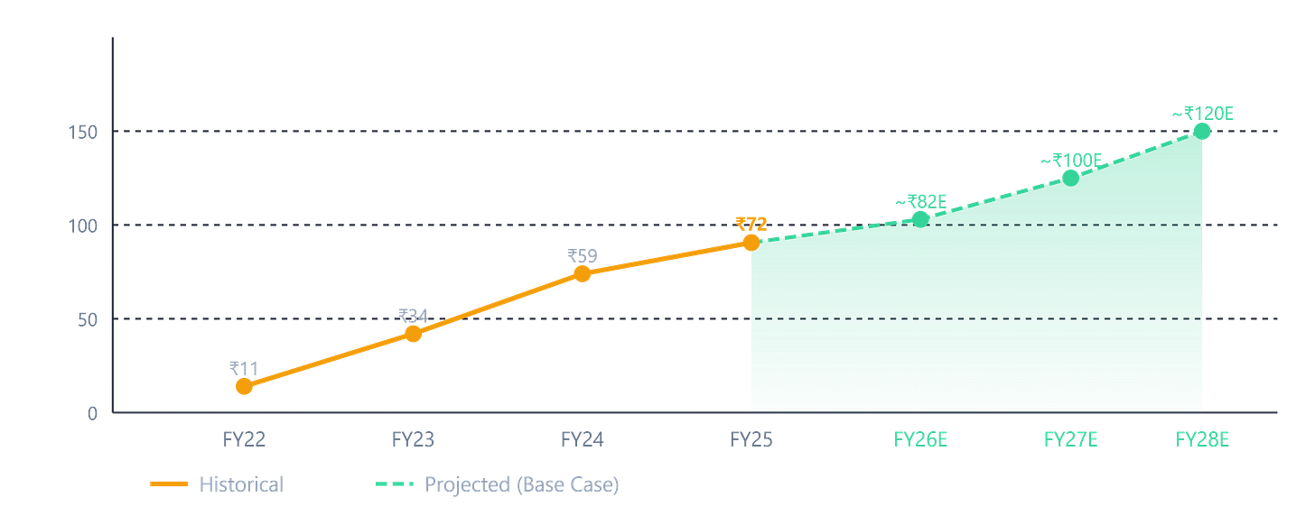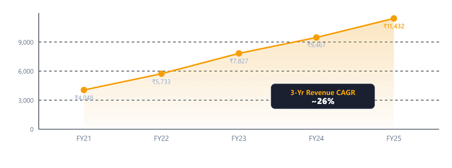 Let’s start with the headline. Between FY22 and FY25, revenue grew at a 3-year CAGR of ~26% — from ₹5,733 crore to ₹11,432 crore. Profit over the same period? A staggering ~58% CAGR. That’s not just a growing company; that’s a company whose profitability is accelerating much faster than its revenue, which tells you margin expansion is real.