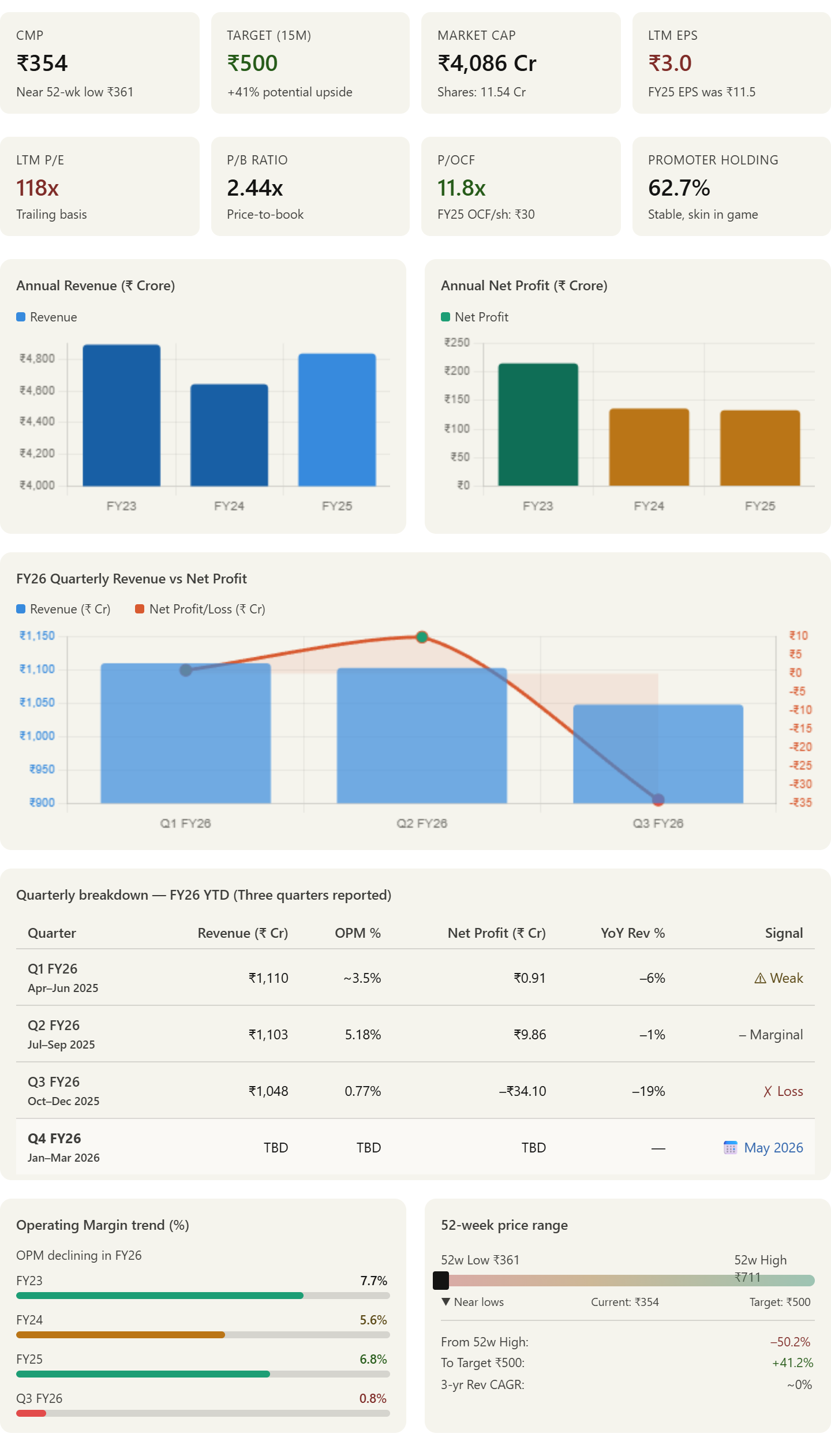 Q3 FY26 (October–December 2025): This was the gut-punch. Revenue dropped 18.5% year-on-year to ₹1,048 crore. The company reported a net loss of ₹34.1 crore versus a profit of ₹33.4 crore in Q3 FY25. Operating margin collapsed to 0.77% — basically nothing. The stock unsurprisingly got hammered.