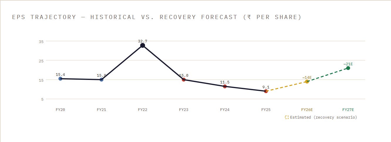 5-Year View: If operating margins recover to 18% by FY29–30 on revenues of ~₹11,000–12,000 crore (a reasonable assumption given the new capacity coming online), EPS could reach ₹35–40. At a 25x multiple, the stock would be in the ₹875–1,000 range — roughly 2x to 2.3x from current levels. That’s a 15–18% CAGR over 5 years.