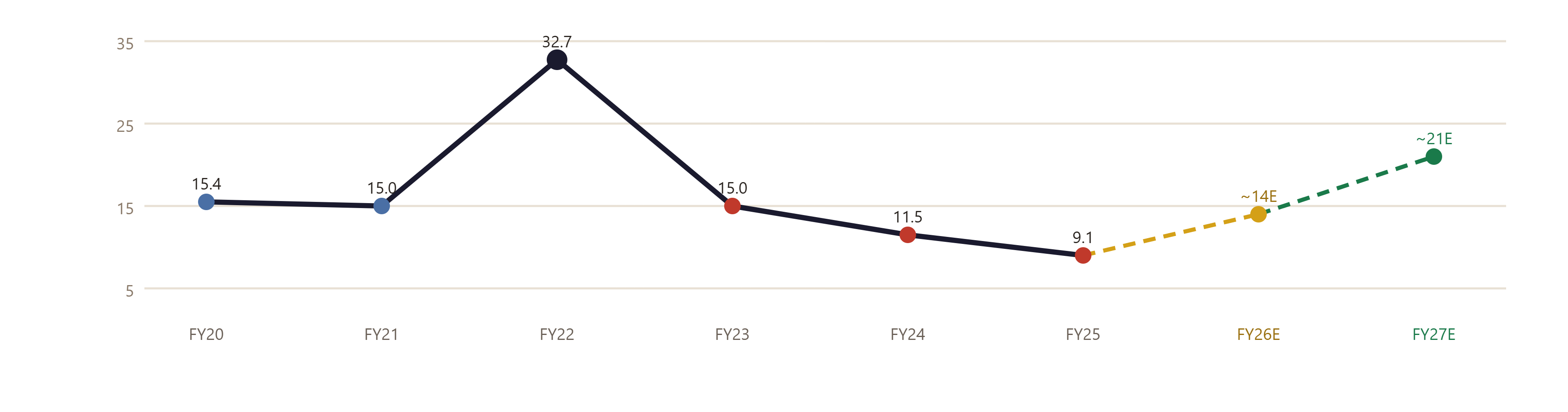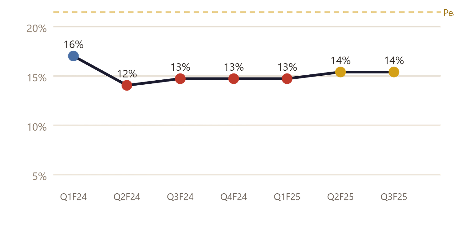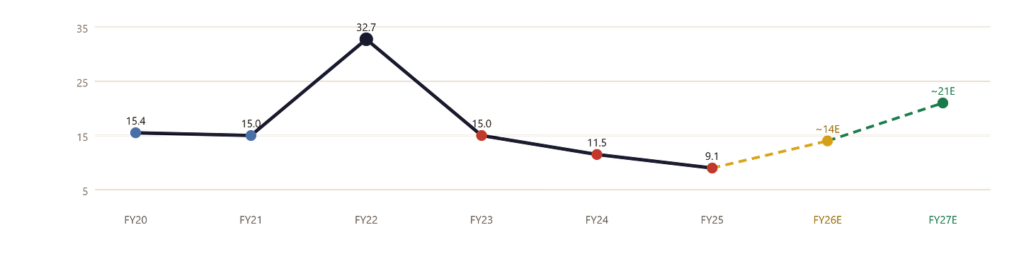 1. Operating Margin Trend. Margins need to move from the current 13–14% toward 16% by end of FY27. If they’re stuck at 13% even as volumes grow, the thesis is weakening. Watch for each quarterly OPM number.