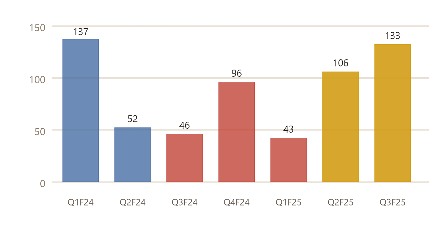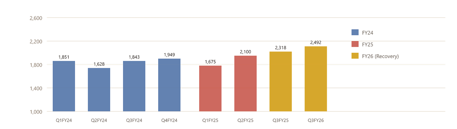 Here’s the setup: this company went through a rough patch in FY24 and FY25 — profits dropped, margins got squeezed, and everyone quietly moved on. But look at the last three quarters and a very different picture is emerging. Revenue has climbed steadily, profits have nearly tripled from their trough, and exports just hit their highest-ever share of revenues at 65%.